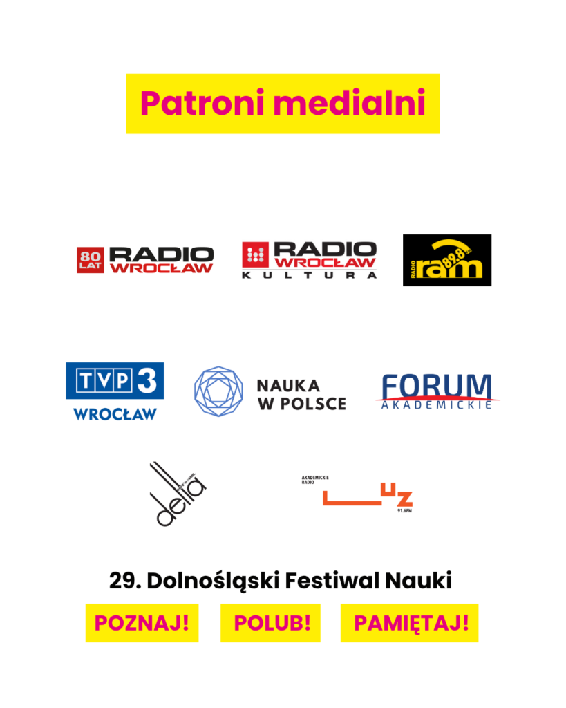 Dobra nauka potrzebuje dobrej komunikacji — dlatego bardzo cieszymy się, że 29. Dolnośląski Festiwal Nauki został objęty patronatami medialnymi przez grono ważnych i różnorodnych redakcji. Wśród patronów tegorocznej edycji znaleźli się: TVP3 Wrocław, Radio RAM, Akademickie Radio LUZ, „Nauka w Polsce”, „Forum Akademickie”, „Delta” oraz inni partnerzy medialni wspierający nasze działania informacyjnie i promocyjnie.
